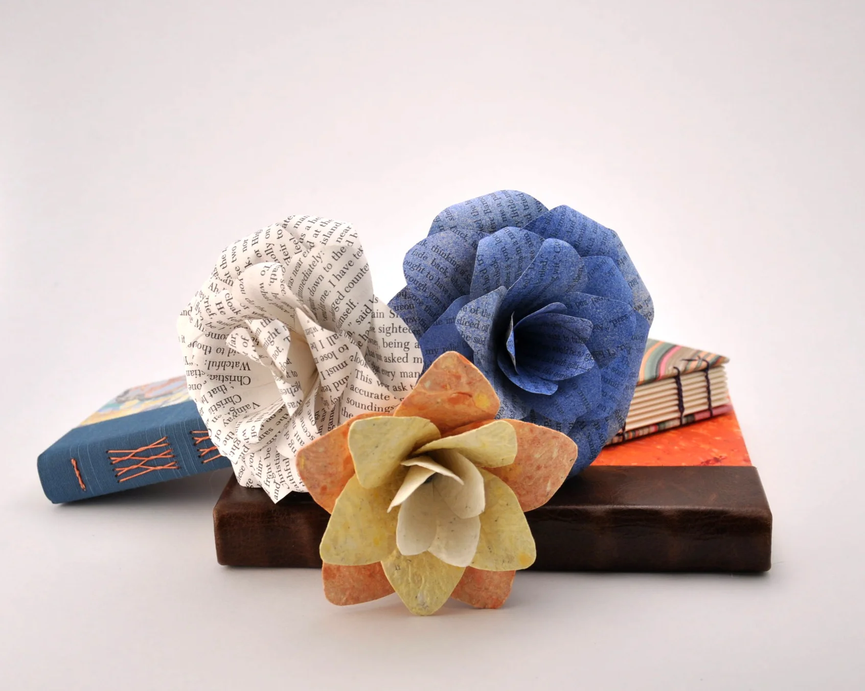 Most of the roses are made from old book pages. Some are left blank and others I color with paint or colored pencils. Some roses are made from handmade or decorative papers. I like to call them my “undead roses” because they aren’t alive and they will never die.